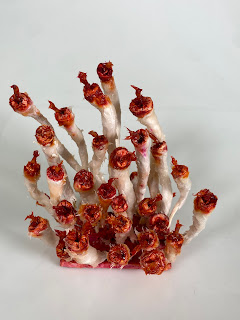 I respond to the nostalgia associated with this object, the button. The antique buttons are from the past, still on the cardboard to be sold, they never made it to the dressmakers. I think of people touching these small objects to fasten their clothes and mothers buttoning up a child's jacket. Formally, I am attracted to the individual design of buttons. The colors, textures and motifs. I find these particular buttons alluring due to the pearl like quality.